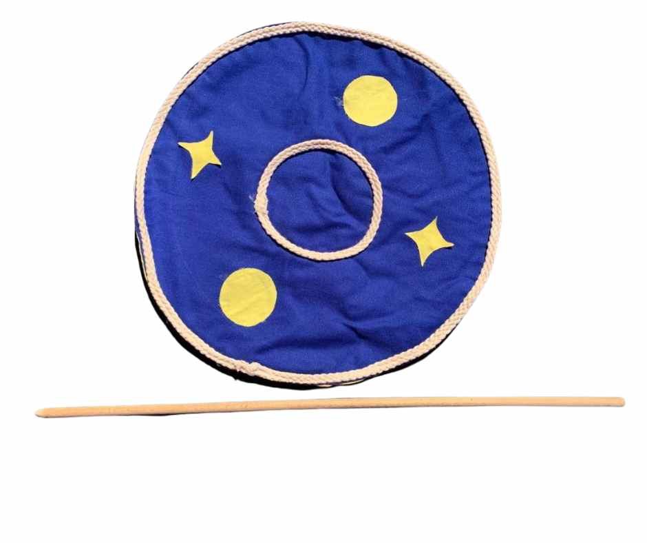 Pratinho em tecido azul e amarelo com detalhes em barbante, mais varinha de madeira para prática de equilíbrio.